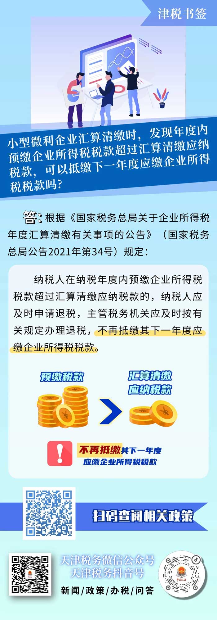 【津税书签】小型微利企业汇算清缴,若预缴税款超过应纳税款,能否抵缴下一年度企业所得税税款?