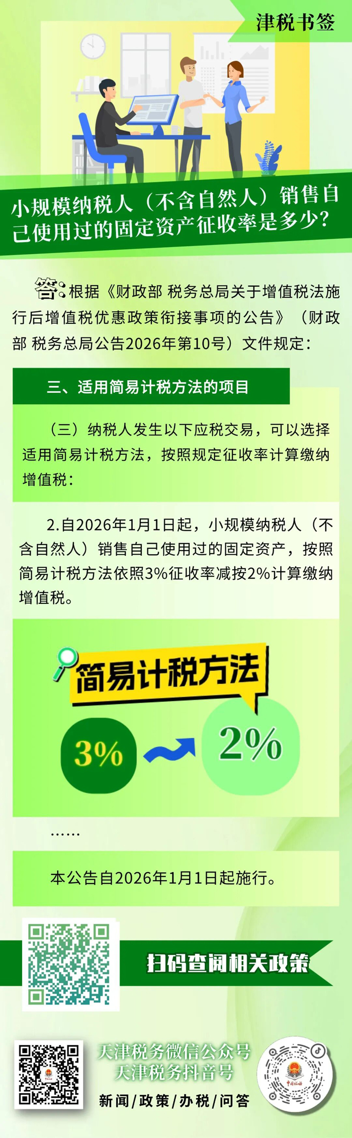【津税书签】小规模纳税人(不含自然人)销售自己使用过的固定资产征收率是多少?
