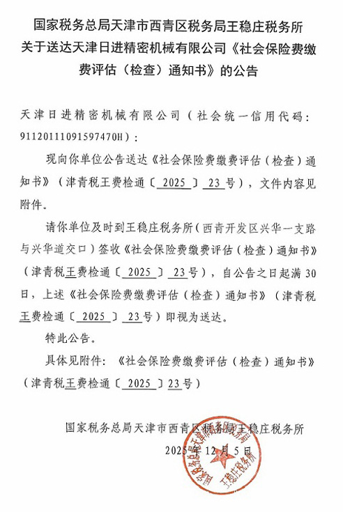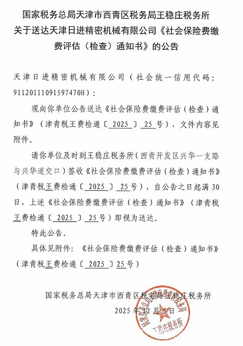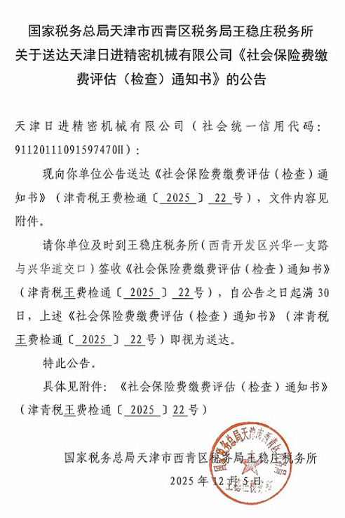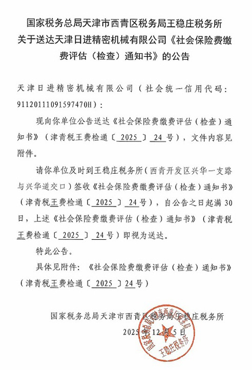 国家税务总局天津市西青区税务局王稳庄税务所关于送达天津日进精密机械有限公司《社会保险费缴费评估(检查)通知书》的公告