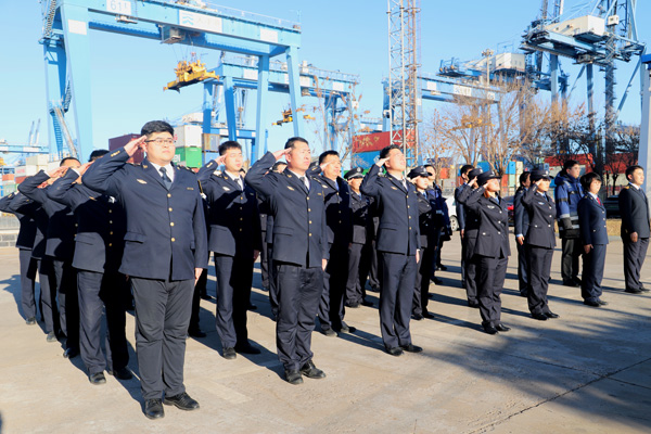 2025年1月1日上午,天津海港口岸红旗飘扬,国家税务总局天津市税务局第四税务分局联合东港边检站和天津海事局船舶交通管理中心、辖区码头公司等单位在此举行升旗仪式,凝聚共建共识、强化责任担当,共同奏响服务海港高质量发展的奋进乐章。
