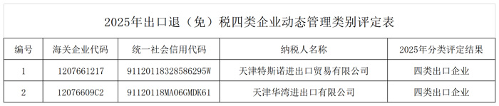 根据国家税务总局修订后的《出口退(免)税企业分类管理办法》(国家税务总局公告2016年第46号)和《国家税务总局关于加快出口退税进度有关事项的公告》(国家税务总局公告2018年第48号)的有关要求,现将2025年度出口退(免)税动态调整四类企业名单予以发布。