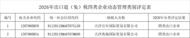 根据国家税务总局修订后的《出口退(免)税企业分类管理办法》(国家税务总局公告2016年第46号)和《国家税务总局关于加快出口退税进度有关事项的公告》(国家税务总局公告2018年第48号)的有关要求,现将2026年度出口退(免)税动态调整四类企业名单予以发布。